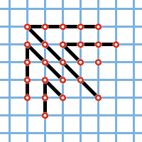 Существует другое, не менее интересное и совершенно неожиданное доказательство теоремы Эйлера, принадлежащее американскому математику XIX века Дж. Сильвестру. Вот конструкция Сильвестра: пусть имеется разбиение числа n на нечётные части: (2k1+1, 2k2+1, ..., (2kq+1), где k1 ≥ k2 ≥ ... ≥ kq. На листе клетчатой бумаги в некотором её узле поставим точку x1. Справа от x1, поставим в узлах k1 точек и столько же точек поставим в узлах, расположенных под точкой x1. Затем проделаем то же самое с числом k2, взяв в качестве исходной точку x2, расположенную в следующем за точкой x1 по диагонали направо вниз узле, и т.д., пока не дойдём до числа kq.