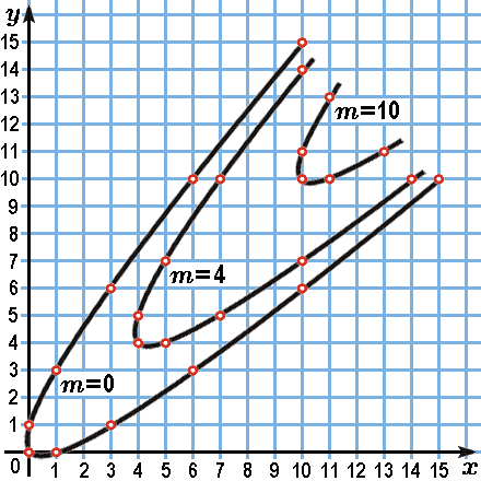Смысл чисел m и q станет более наглядным, если представлять себе векторы вида (3) при m=0 как точки с целыми координатами параболы k(x, y) = 0, лежащей в плоскости (x, y). (Вы понимаете, почему это парабола?) Тогда полученные нами целочисленные решения неравенства k(x, y) ≥ 0. показывают, что все точки с целыми координатами, лежащие на параболе k(x, y) = 0 и внутри неё, получаются сдвигами целых точек этой параболы на векторы (m, m) (рис. 3). Удобно считать, что число m (m=0, 1, 2, ...) — номер параболы, на которой лежит точка (x, y), a q = x–y = 0, ±1, ±2, ... — номер точки на этой параболе.