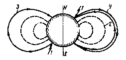 1 — грозовой разряд; 2 — силовые линии магнитного поля Земли;