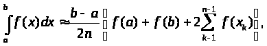 Где f(x>k-1>) и f(x>k>) - соответственно основания трапеций; x>k >- x>k-1> = (b-a)/n - их высоты.