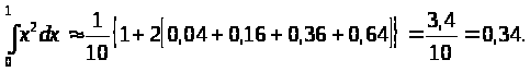 Вычислим теперь по формуле трапеций его приближенное значение. Пусть n=5. Тогда имеем: a=x>0>=0, x>1>=0,2, x>2>=0,4, x>3>=0,6, x>4>=0,8, x>5>=1=b и соответственно f(x>0>)=0, f(x>1>)=0,04, f(x>2>)=0,16, f(x>3>)=0,36, f(x>4>)=0,64, f(x>5>)=1. Следовательно,
