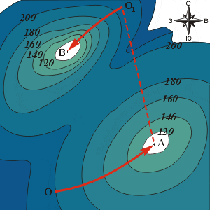 – Очень просто. С помощью фонарика мы способны лишь убедиться, что из данной точки пути ведут вниз. А что там, дальше? Вот тут наши друзья предложили ряд способов, – он снисходительно показал на оставшиеся листки из судового журнала. – Они исходили из того, что на острове только одна низина. А если их много, и вода лишь в самой низкой из этих низин (рис. 5)? Спуск приведёт нас в точку A, а вода в точке B – там гуще горизонтали и, следовательно, ниже отметка. Задумайтесь над этим.