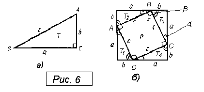 ДОКАЗАТЕЛЬСТВО ТЕОРЕМЫ ПИФАГОРА. Пусть Т— прямоугольный треугольник с катетами а, b и гипотенузой с (рис. 6, а). Докажем, что с2=а2+Ь2.