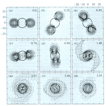 Гидродинамический расчет слияния нейтронных звезд (из работы К. Охара и Т. Накамура, Япония). Контурами показана плотность, стрелками -скорость. Время (в правом верхнем углу квадратов) в миллисекундах. Окружность - гравитационный радиус черной дыры, равной по массе сумме двух сливающихся объектов.