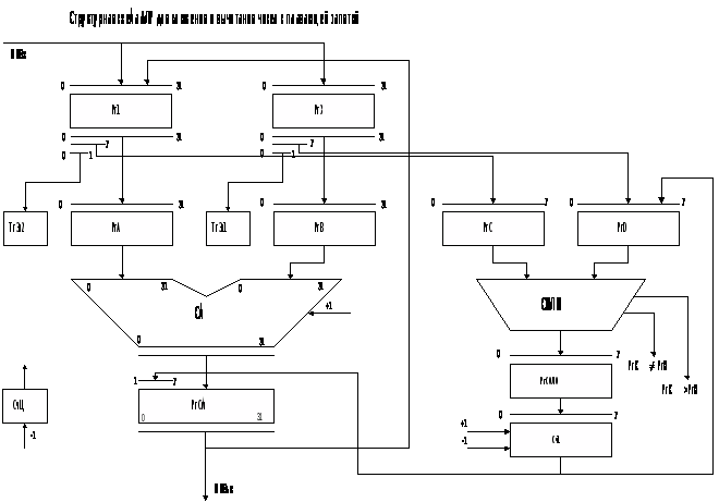 После выравнивания порядков модули мантисс хранятся в Pгl и РгЗ в разрядах с 8-го по 31-й, их знаки в Тг3н2 и Тг3н1, а порядок результата в Сч1.