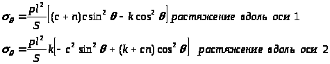 Введем следующие обозначения 2a, 2b - главные оси эллипса, с=a/b, р - усилие на единицу площади. В нашем случае отношение полуосей эллипса с=1/2. Вдоль оси 1 на бесконечности приложено растягивающее усилии р, а вдоль оси 2 - сжимающее -р. Наша задача найти напряжения на краю отверстия и построить их эпюру.