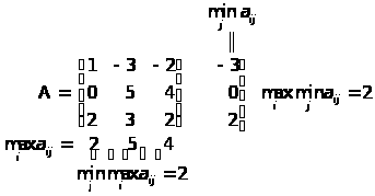 т.е. определяется max выигрыш игрока 1, при условии, что игрок 2 применит свою j-ю чистую стратегию, затем игрок 2 отыскивает такую свою j = j>1> стратегию, при которой игрок 1 получит min выигрыш, т.е. находит
