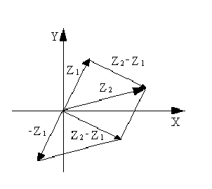 Согласно определению сложения двух комплексных чисел, действительная часть суммы равна сумме действительных частей слагаемых, мнимая часть суммы равна сумме мнимых частей слагаемых. Точно также определяются координаты суммы векторов:Сумма двух векторов с координатами (A>1>;B>1>) и (A>2>;B>2>) есть вектор с координатами (A>1>+A>2>;B>1>+B>2>). Поэтому, чтобы найти вектор, соответствующий сумме комплексных чисел Z>1> и Z>2> нужно сложить векторы, соответствующие комплексным числам Z>1> и Z>2>.
