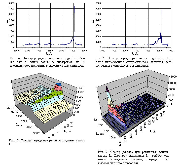 Для слабых пиков (3790A, 3750A) наблюдается противоположный эффект. Интенсивность пиков уменьшается вдвое, когда длина катода сокращается только на 25%, что хорошо видно на рис. 6. Вероятно, это связано с резкой зависимостью вероятности возбуждения соответствующих уровней от энергии быстрых осциллирующих внутри полости электронов. Потери быстрых электронов через выходную апертуру катода сильно зависят от отношения длины катода к диаметру апертуры [3,4,5,11].
