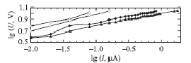 Отжиг ПК на воздухе привел, как и следовало ожидать, к резкому снижению его электропроводности вследствие окисления наночастиц кремния. Прохождение тока до пробоя удалось зафиксировать лишь у диодных структур с прослойкой чистого ПК и ПК с хромом на КЭС 0.01 после отжига при 700C. ВАХ этих диодов (рис. 3 и 4) являются нелинейными со степенным законом I - Vn, на который, как и в [6,7], накладывалсь ступенчатые изменения тока. Как следует из рис. 3, в чистом ПК n = 3-5. В ПК с хромом (рис. 4) проводимость при U = 10V уменьшилась в 40 раз, видимо из-за химической реакции оксида хрома с наночастицами кремния. Однако закон изменения тока в данном случае более слабый: n 2, как и при протекании инжекционных токов в диэлектриках. Ступеньки тока и большие величины n свидетельствуют о дискретном туннелировании электронов в ПК сквозь наноразмерные гранулы кремния. Величина n 2 в ПК с хромом может быть связана с меньшей, чем у SiO2, шириной запрещенной зоны оксида хрома и б´ольшим вкладом инжекционных токов, поскольку согласно рис. 2, гранулы кремния в нем почти такие же, как и в чистом ПК.