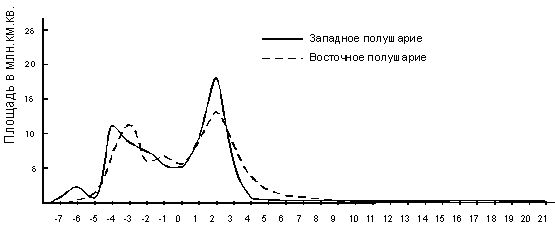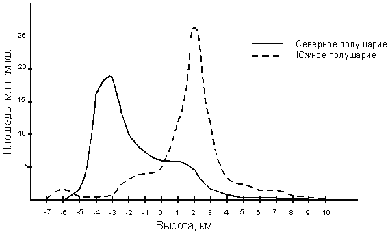 Рис. 2 – Распределение высот поверхности Северного и Южного полушария Марса. В Северном полушарии преобладают поверхности высотой от –2 до –5 км; этот уровень соответствует равнинным территориям. В Южном полушарии в основном распространены высотные ступени от 1 до 3 км, на таких высотах расположены возвышенности.