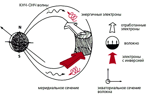 Дело в том, что в околоземном космическом пространстве действуют ускорительные механизмы, которые особенно интенсивны во время магнитных бурь. В первую очередь эти механизмы обусловлены электрическими полями, генерируемыми при взаимодействии солнечного ветра с магнитным полем Земли: поля ускоряют и переносят заряженные частицы во внутренние области магнитосферы, формируя радиационный пояс. Удивительным оказался тот факт, что полная концентрация частиц (как электронов, так и ионов) в радиационном поясе переставала расти, достигнув определенного значения, хотя ускорительные механизмы продолжали действовать. Это открытие не только породило фундаментальную физическую проблему - оно имеет и практическое значение. Обнаруженный эффект принципиально важен для безопасности космических полетов на околоземных орбитах, и для него решающее значение имеют процессы, происходящие в космических циклотронных мазерах. Но прежде чем переходить к анализу работы последних, остановимся еще на одной группе экспериментальных фактов.
