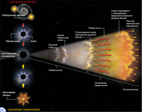 Согласно доктору Паулю Фрэнсису, старшему лектору в Австралийском Национальном Университете и астрофизику Прайсу из Mount Stromlo Observatory, недавно появились две конкурирующие гипотезы объяснения причин вспышек гамма-излучения. Одна из них заключалась в том, что вспышки гамма-излучения возникают из-за столкновения нейтронных звезд и черных дыр. Другая основывалась на вспышках гамма-излучения в момент коллапса новых звезд и становления черных дыр.