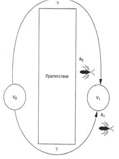 Два муравья из муравейника должны добраться до пищи, которая находится за препятствием. Во время перемещения каждый муравей выделяет немного феромона, используя его в качестве маркера.