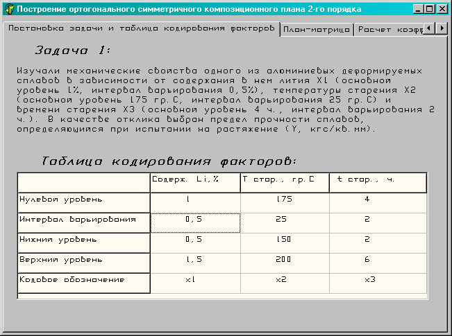 Изучали механические свойства одного из алюминиевых деформируемых сплавов в зависимости от содержания в нем лития Х1 (основной уровень 1%, интервал варьирования 0,5%), температуры старения Х2 (основной уровень 175 гр.С, интервал варьирования 25 гр.С) и времени старения Х3 (основной уровень 4 ч., интервал варьирования 2 ч.). В качестве отклика выбран предел прочности сплавов, определяющийся при испытании на растяжение (Y, кгс/кв.мм).
