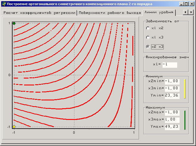 Построить двумерные сечения поверхности отклика, соответствующие пересечению поверхности с плоскостями Xi=Ximax. Для этого в уравнение регрессии необходимо подставить значение этого фактора, и по полученным двухфакторным уравнениям рассчитать, а потом построить изолинии поверхности отклика (кривые равного выхода).
