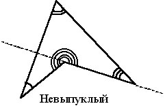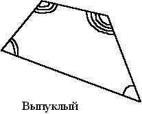 Многоугольник (и вообще любую фигуру) называют выпуклым, если для любых его двух точек отрезок с концами в этих точках полностью принадлежит многоугольнику (фигуре). В частности, треугольник и круг – выпуклые фигуры, а граница треугольника (трехзвенная замкнутая ломаная) и окружность – невыпуклые фигуры. Многоугольник является выпуклым тогда и только тогда, когда все его внутренние углы меньше 180° (см. рисунок). Выпуклый многоугольник всегда расположен в одной полуплоскости относительно каждой прямой, проходящей через его сторону. |