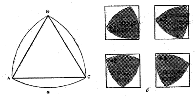 Если кривая постоянной ширины ограничена двумя парами параллельных прямых и одна пара пересекается с другой под прямым углом, то кривая постоянной ширины с необходимостью должна быть вписана в квадрат. Подобно окружности или любой другой кривой постоянной ширины, треугольник Рело может вращаться в квадрате, плотно прилегая к сторонам последнего, то есть все время касаясь всех четырех сторон квадрата (рис. 3,б). Читатель может убедиться в этом, вырезав треугольник Рело из картона и вставив его в квадратное отверстие надлежащих размеров.