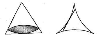 Довольно долго математики считали, что решением проблемы Какейя служит кривая, изображенная на (рис. 9 справа), ее площадь равна половине площади круга. (Эта кривая называется гипоциклоидой. Такую кривую описывает точка окружности, катящейся без скольжения внутри большей окружности, если диаметр меньшей окружности составляет 1/3 или 2/3 диаметра большей.) Отломив кусок спички нужных размеров, вы на опыте убедитесь в том, что ее можно повернуть внутри гипоциклоиды как некий одномерный ротор. Обратите внимание, что концы спички будут все время оставаться на контуре гипоциклоиды.