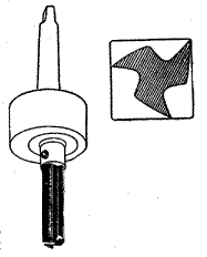 Сверло Уаттса изображено на рис. 4. Справа показано поперечное сечение сверла внутри квадратного отверстия. Сверление производится так. Сначала на металл накладывают металлический шаблон с квадратным отверстием нужных размеров. Сверло, вращаясь внутри отверстия в направляющей пластине (шаблоне), врезается кромками в металл и просверливает в нем квадратное отверстие. Как видно из рис.8, сверло Уаттса представляет собой просто-напросто треугольник Рело, в котором прорезаны углубления для отвода стружки и заточены режущие кромки. Когда треугольник Рело вращается, его центр не стоит на месте, поэтому патрон для зажима сверла Уаттса не должен препятствовать этому движению. Компания запатентовала специальный патрон со «свободно плавающим в нем сверлом», удовлетворяющий всем нужным требованиям.