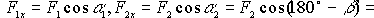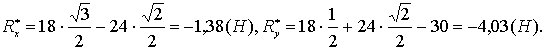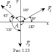 Направим ось y по линии действия силы F>3>, а ось х перпендикулярно к ней. Из рисунка 1.23 видно, что сила F>1> образует с положительными направлениями осей углы 30° и 60°, сила F>2> - 135° и 45° и сила F>3> - 90° и 180°. Пользуясь формулами (1.16) получаем: