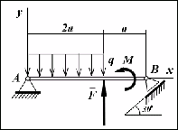 Пример. Определить реакции шарнирных опор А и В балки, находящейся под действием сосредоточенной силы F = 60 Н, равномерно распределенной нагрузки с интенсивностью q = 15 Н/м и пары сил с моментом М = 40 Н · м; расстояние а = 1 м.