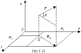 б) найденную проекцию силы на плоскость проецируют на данную ось (ось х). Это и дает искомую проекцию силы на ось. В случае, изображенном на рисунке 1.21, найдем, что: