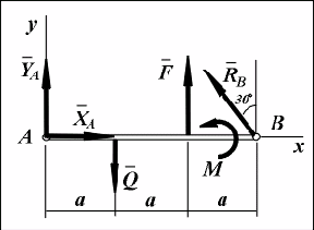 Для определения опорных реакций рассмотрим равновесие балки. К ней приложены активные силы: F, пара сил с моментом М и равномерно распределенная нагрузка. Заменим распределенную нагрузку ее равнодействующей Q, равной по модулю Q = q · 2a = 30 Н и приложенной в средней точке участка ее действия.