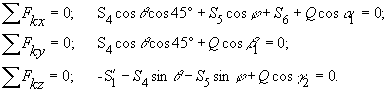 Теперь рассмотрим равновесие узла М. На этот узел, кроме силы Q, действуют реакции S4, S5, S6 и S'1. При этом на основании аксиомы взаимодействия реакция S'1 направлена противоположно S1, но численно S'1 = S1 = - 172 Н.