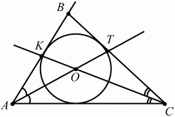 Центр окружности, вписанной в треугольник, является точкой пересечения его биссектрис (рис. 8). В ⊿ABC отрезки AT и СК являются биссектрисами.