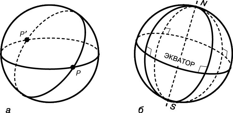 Ф.Клейн (1849–1925) первым увидел, как избавить сферическую геометрию от одного из ее недостатков – того, что две лежащие в одной плоскости «прямые» (два больших круга на сфере) имеют не одну общую точку, а две (рис. 2).