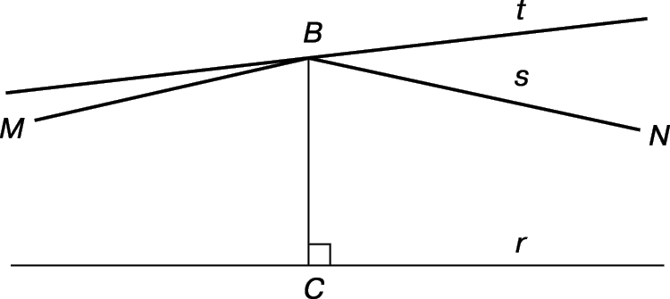 Из абсолютной геометрии Бойяи можно вывести евклидову геометрию, добавив евклидову (или аффинную) аксиому: через точку B, не лежащую на данной прямой r, можно провести не более одной прямой, параллельной данной. Гиперболическую геометрию можно вывести из абсолютной геометрии, добавив гиперболическую аксиому. Система аксиом гиперболической геометрии отличается от эвклидовой аксиоматики в одном: в качестве аксиомы о параллельных берется положение о том, что «через точку, находящуюся вне прямой, можно провести две прямые линии, параллельны ей». Из этой аксиомы шаг за шагом геометрически выводятся другие свойства этой геометрии. Таким образом, лучи BM и BN на рис. 2 могут быть оба параллельны r, а если M и N их концы, то r называется «прямой MN». Любая прямая, например t, являющаяся продолжением стороны угла NBM, образует с r пару «гиперпараллельных», т.е. пару прямых, которые не пересекаются и не параллельны. Две такие прямые имеют единственный общий перпендикуляр. Множество прямых, перпендикулярных данной прямой a, называются «пучком гиперпараллельных» с «осью» a.