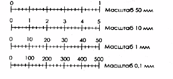 Масштабом равномерной шкалы называется длина отрезка (графический интервал), принятого за единицу и измеренного в каких-либо мерах. Чем меньше масштаб (рис.1.5), тем гуще располагаются на шкале точки, имеющие одно и то же значение. Построить шкалу - это значит заданный носитель шкалы разметить графическими интервалами с соответствующими числовыми обозначениями согласно условиям задачи.