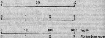 Из неравномерных наибольшее распространение имеет логарифмическая шкала. Методика ее построения несколько иная, так как на этой шкале отрезки пропорциональны не изображаемым величинам, а их логарифмам. Так, при основании 10 1д1 = О-1д1 = 0 = 1; 1д100 = 2 и т.д. (рис. 4).