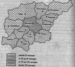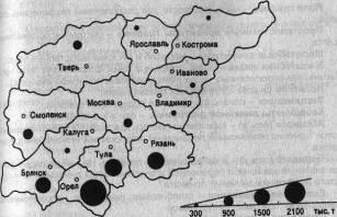 Рис. 19. Плотность населения в областях Центрального района России (человек на 1 м2)