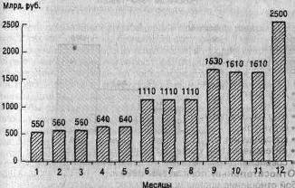 В соответствии с изложенными выше правилами на горизонтальной оси размещаются основания двенадцати столбиков на Одинаковом расстоянии друг от друга, в данном случае 0,5 см. ширина столбиков принята 0,5 см. Масштаб на оси ординат - 500 млрд. руб. - 1 см. Наглядность данной диаграммы достигается Равнением величины столбиков.