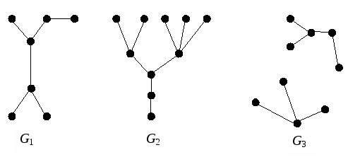 Определение 1. Деревом называется связный граф, не содержащий циклов. Любой (в том числе несвязный) граф без циклов называется ациклическим. Несвязный граф, каждая компонента связности которого является деревом, называется лесом. Можно сказать, что деревья являются компонентами леса. На рис.1 изображены два дерева G1, G2 и лес G3.