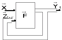 Та же самая экспертная система определения профессиональной пригодности, но с условием, что значение о профессиональной пригодности зависит от ранее полученных ответов. Такие экспертные системы называют самообучающимися, т. к. сразу правильного ответа не дают. Частным случаем конечного автомата с памятью является автомат с обратной связью по выходу. Для него вектор внутренних состояний в момент времени t+ равен вектору выходных сообщений в момент времени t. Пример конечного автомата с памятью и обратной связью по выходу приведен на рис. 11.