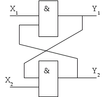 Состояние конечного автомата называется установившимся, если с течением времени при постоянном значении входного вектора Х, вектор Y принимает постоянное значение. В этом случае процесс обучения конечного автомата заканчивается, и результаты его работы могут быть использованы. Однако существуют автоматы, состояние которых не устанавливается с течением времени. Такие автоматы используются только в схемотехнике. Примером такого автомата является автомат триггерного типа. Логическая схема триггера приведена на рис. 12.