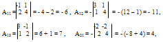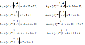 где А>ij> (i=1,2,3; j=1,2,3) – алгебраическое дополнение элемента а>ij> в определителе матрицы А, которое является произведением (- 1)ij на минор (определитель) второго- порядка, полученный вычеркиванием i-строки и j-столбца в определителе матрицы А.