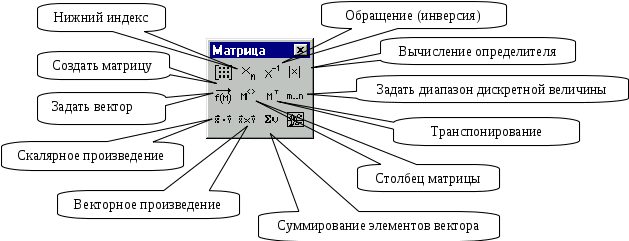 Рассмотрим, как выполняются операции с матрицами в системе MathCad. Простейшие операции матричной алгебры реализованы в MathCad в виде операторов. Написание операторов по смыслу максимально приближено к их математическому действию. Каждый оператор выражается соответствующим символом. Рассмотрим матричные и векторные операции MathCad 2001. Векторы являются частным случаем матриц размерности n x 1, поэтому для них справедливы все те операции, что и для матриц, если ограничения особо не оговорены (например, некоторые операции применимы только к квадратным матрицам n x n). Какие-то действия допустимы только для векторов (например, скалярное произведение), а какие-то, несмотря на одинаковое написание, по-разному действуют на векторы и матрицы.