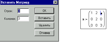 Переместить курсор в документе таким образом, чтобы поместить матрицу между линиями ввода (напоминаем, что линии ввода — это вертикальный и горизон-тальный отрезки синего цвета, образующие уголок, указывающий на текущую область редактирования).