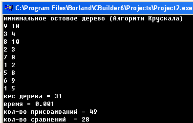 Висновок. Якщо кількість вершин достатньо мала, то доцільніше використовувати алгоритм Прима, в іншому випадку доцільно користуватися алгоритмом Крускала.