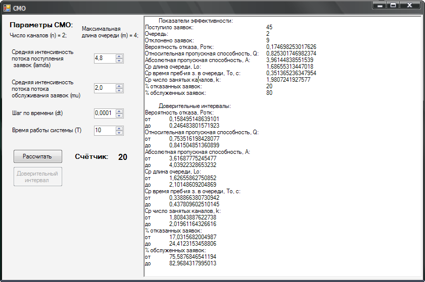 Т.к. показатели эффективности получаются в результате моделирования СМО в течение конечного времени, они содержат случайную компоненту. Поэтому, для получения более надежных результатов нужно провести их статистическую обработку. С этой целью оценим доверительный интервал для них по результатам 20 прогонов программы.