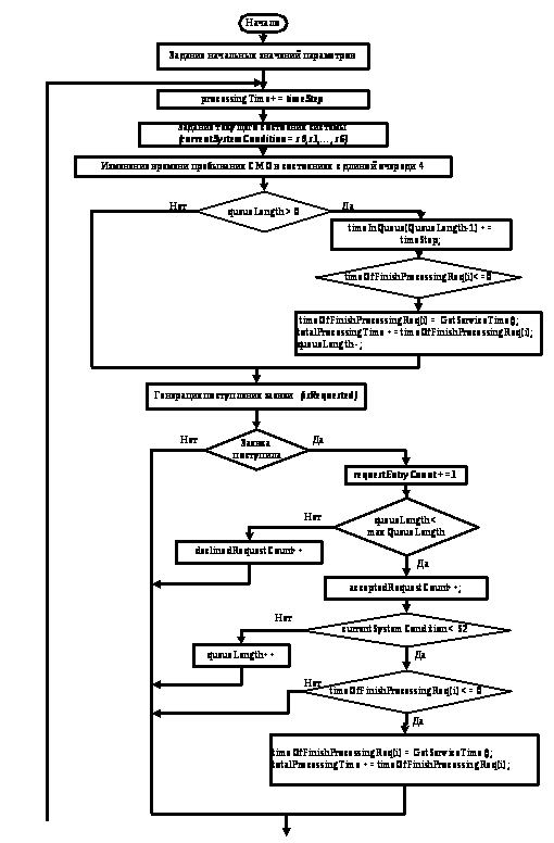 Присутствует такая операция, как помещение заявки на обслуживание в свободный канал. Просматриваются, начиная с первого, все каналы, когда выполняется условие timeOfFinishProcessingReq [i] <= 0 (канал свободен), в него подается заявка, т.е. генерируется время окончания обслуживания заявки.