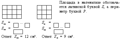 Сколько квадратных сантиметров разместилось по длине каждой фигуры? По ширине? Сколько всего квадратных сантиметров разместилось на площади каждой фигуры. Сравни результат с длиной и шириной и сделай вывод, как найти площадь этих фигур? Сравни их: