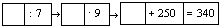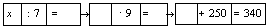 (70 : 7 = 10, 10 . 9 = 90, 90 + 250 = 340)