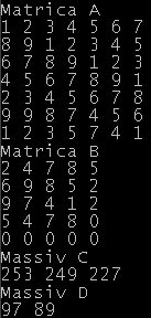 Даны две вещественные матрицы А(7,7) и В(5,5). Из матрицы А сформировать одномерный массив С по правилу, а из матрицы В сформировать массив D по тому же правилу. Для ввода матрицы, формирования одномерных массивов и вывода одномерных массивов применить три PROCEDURE. При вводе матрицы и выводе одномерных массивов вывести на экран сообщения с указанием соответственно имени вводимой матрицы или имени выводимого одномерного массива.