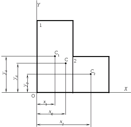 Сечение разобьем на два простых сечения – прямоугольник 1 с центром тяжести С>1> и квадрат 2 с центром тяжести С>2>.