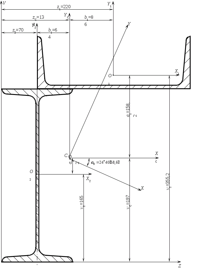 Выбираем вспомогательные оси V, Z и определяем относительно их координаты центра тяжести составного сечения